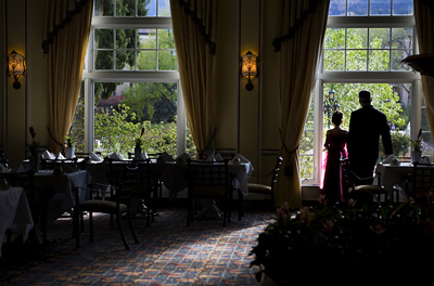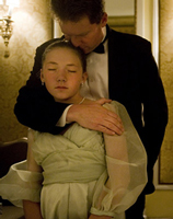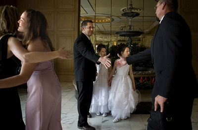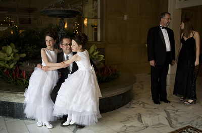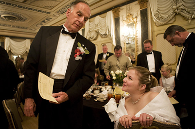 Một cặp cha con đứng bên nhau cạnh cửa sổ phòng khiêu vũ. Sau các nghi lễ, phần khiêu vũ thường kéo dài qua đêm